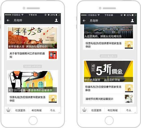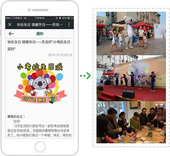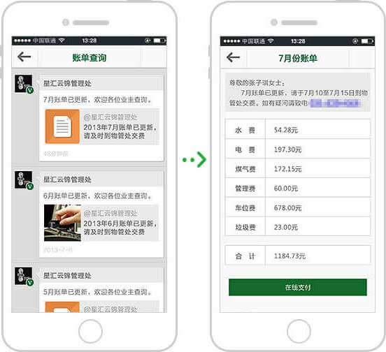 用户可通过微信公众账号随时收到小区物业信息,方便用户随时了解社区动态,告别公告栏